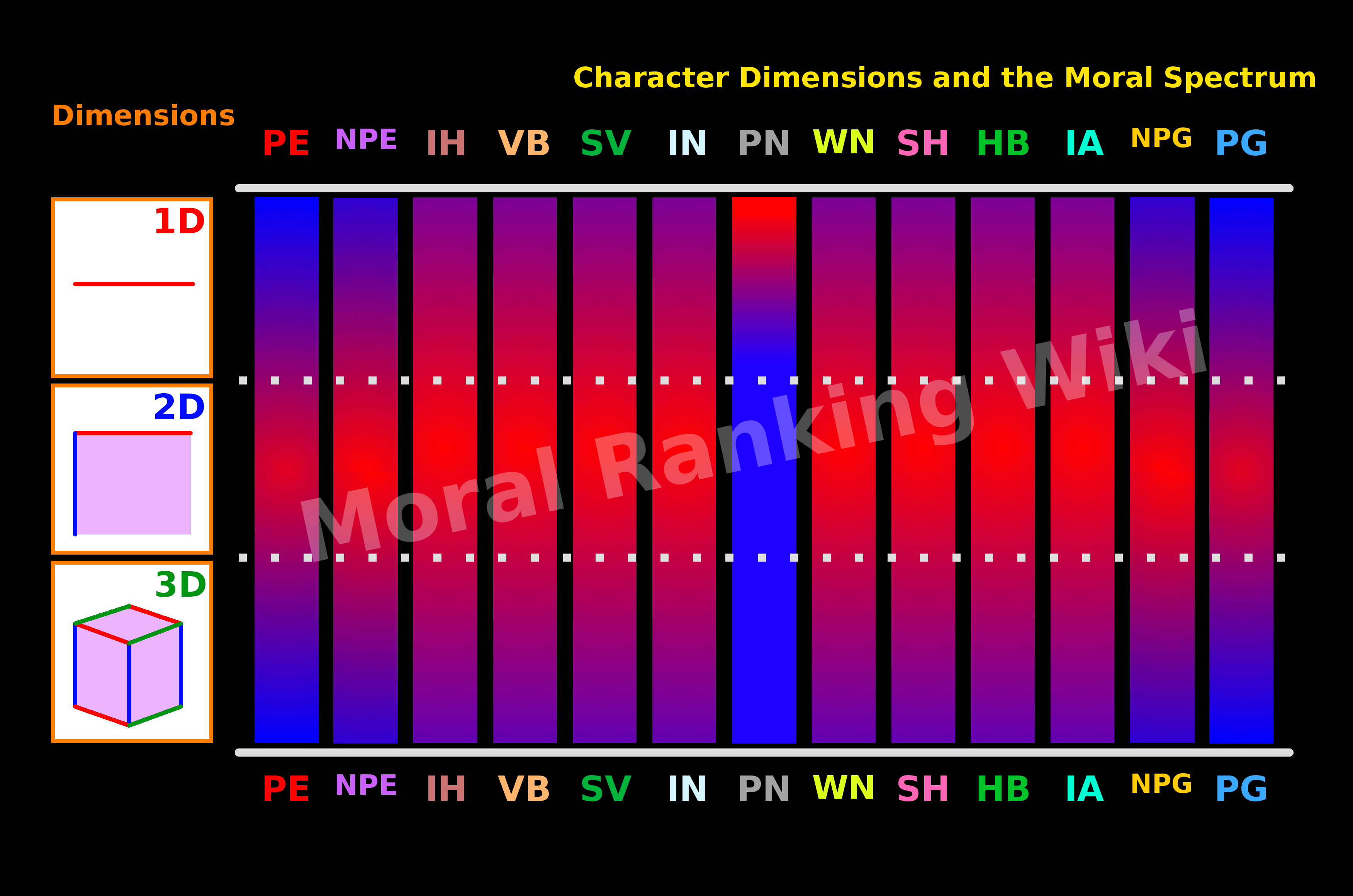 Character Dimensions with the Moral Spectrum. This shows which characters on the Moral Spectrum are able to fall under a specific character dimension.